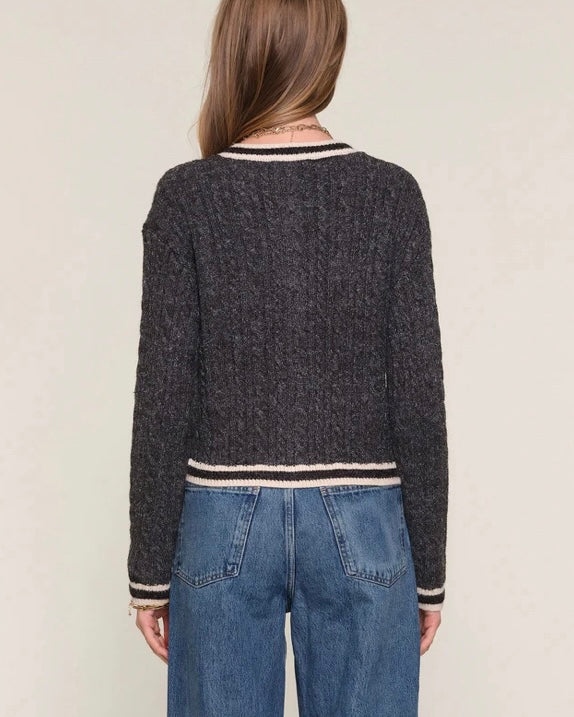 Cardigan en tricot charcoal, bandes crème au col et aux poignets avec boutons décoratifs