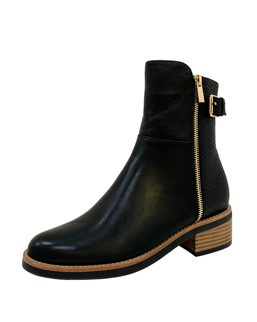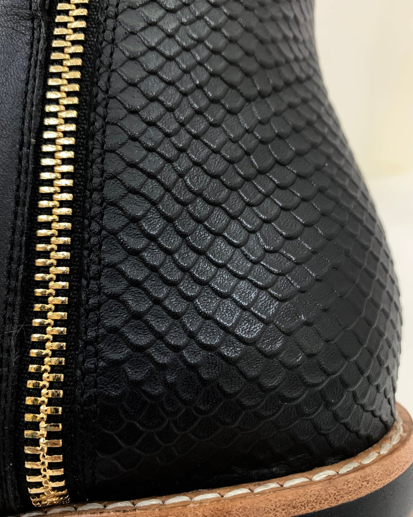 Bottes à double zip avec derrière en serpent tout noir et talon en bois tan. Style: RIPPER BLACK MIX.