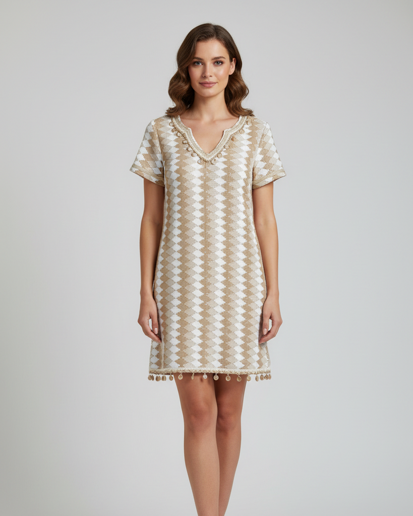 Robe courte à manches courtes, col détaillé avec billes plates de nacre au col et à l'ourlet du bas. Style 4323093; couleur champagne.