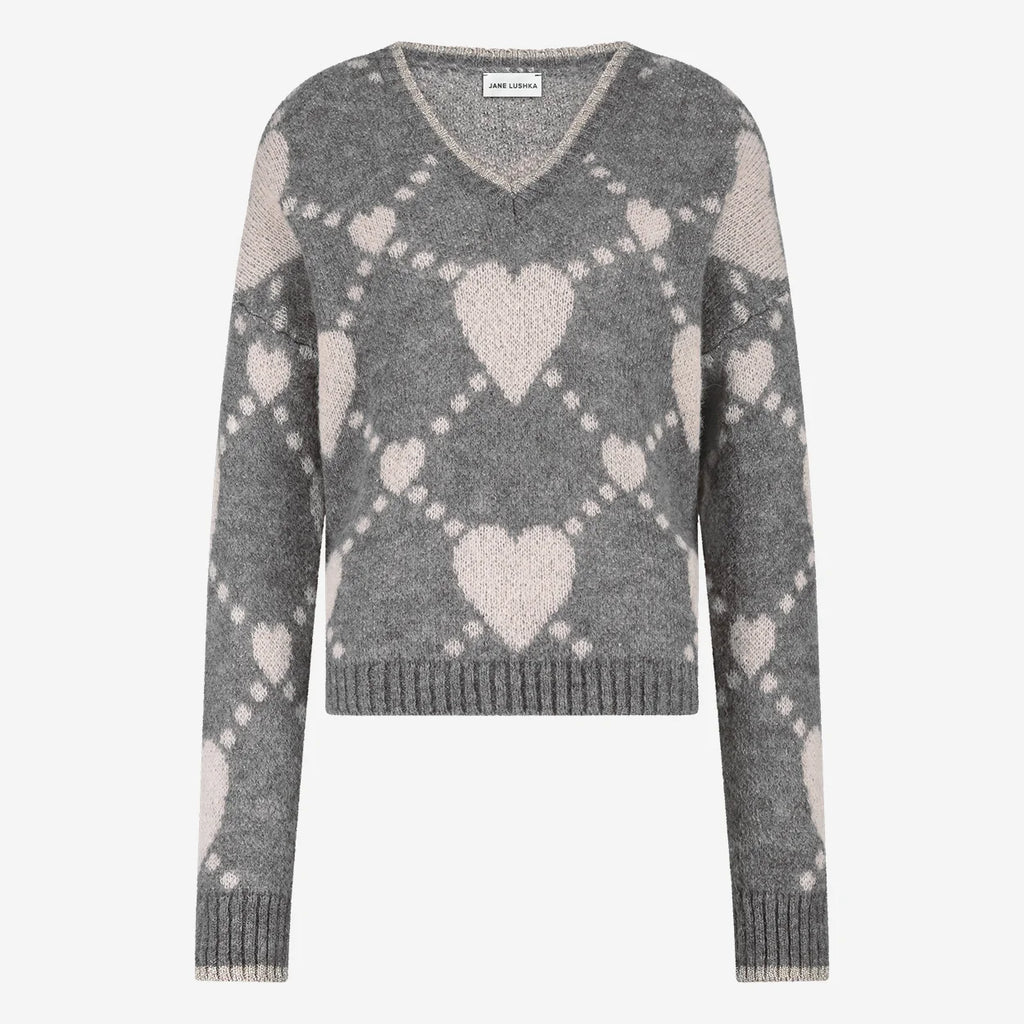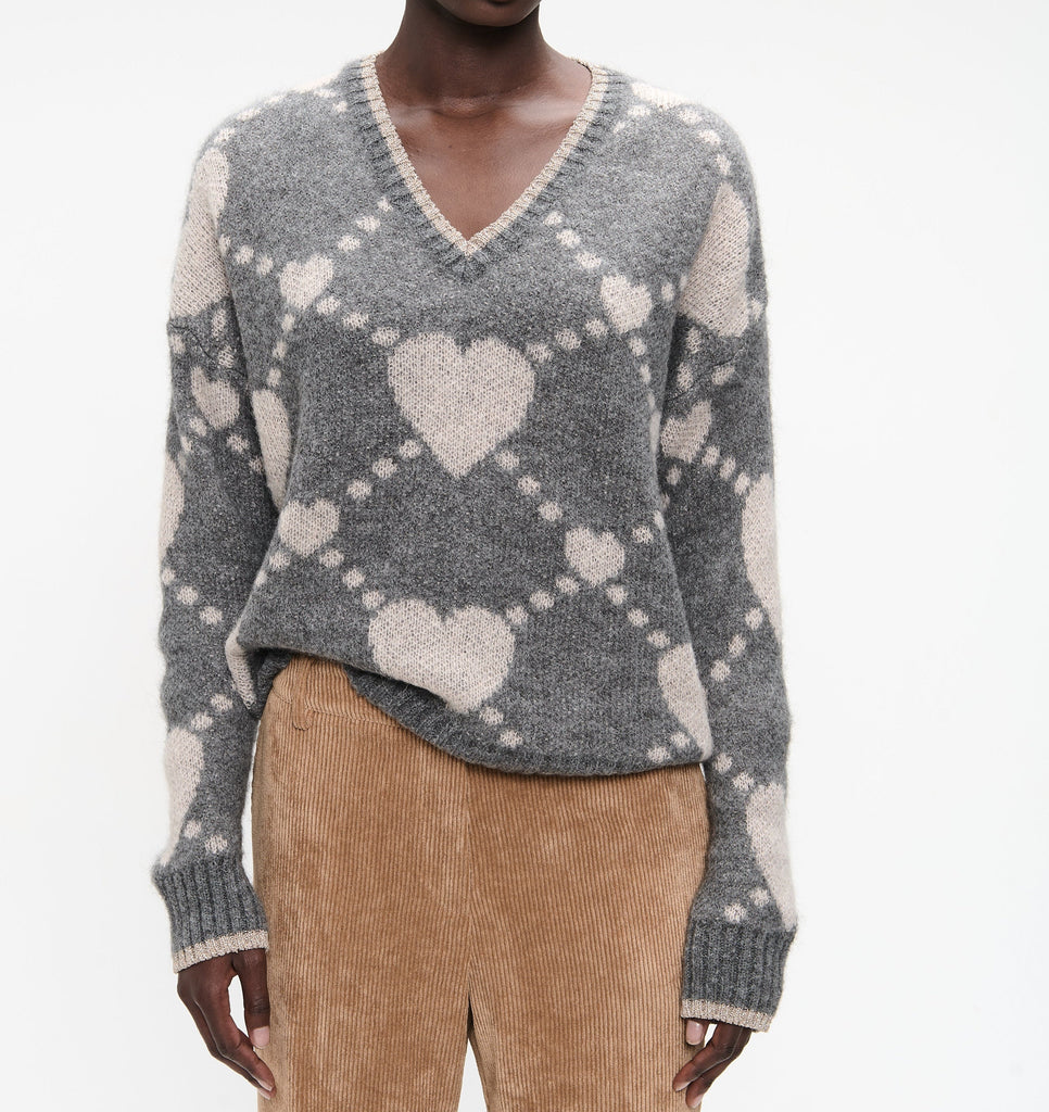 Tricot en laine d’alpaga et polyester gris avec coeurs sable et lurex au col. Style: Hearts Pullover ; Couleur: Grey.