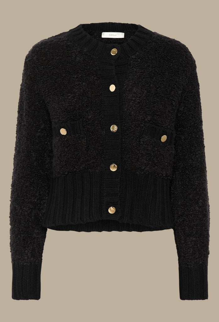 Cardigan de tricot frisé noir avec boutons or et poches appliquées.