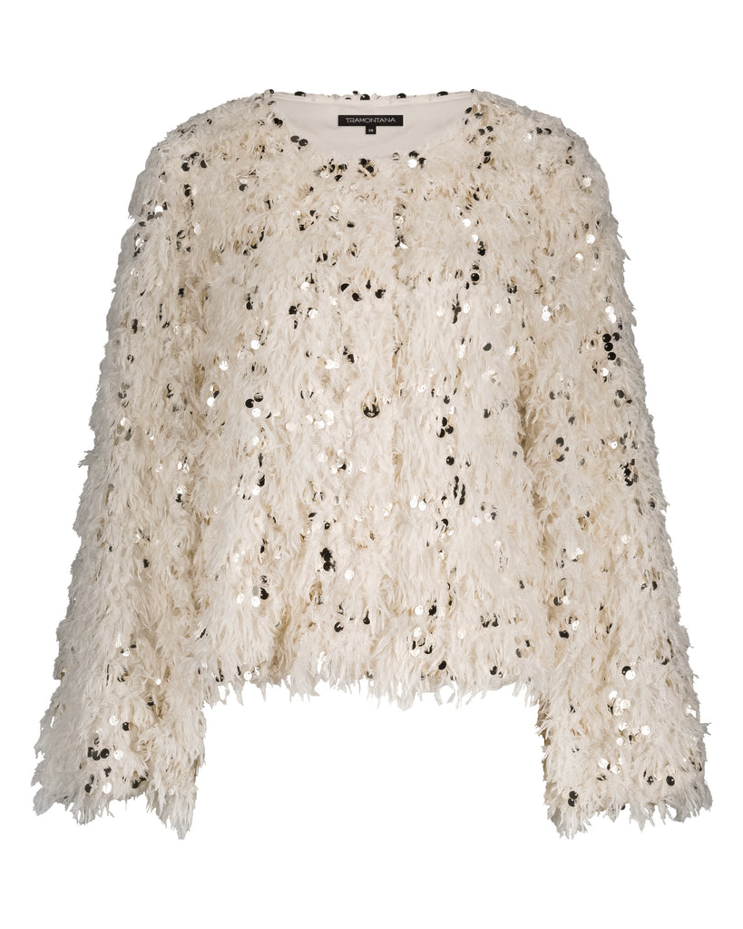 Cardigan à manches longue et à col rond, ample et fluide recouvert de plumes fines et de paillettes
