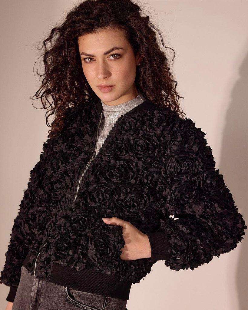 Veste bomber noir fleurs 3D roccoco. Style: C02-18-801.