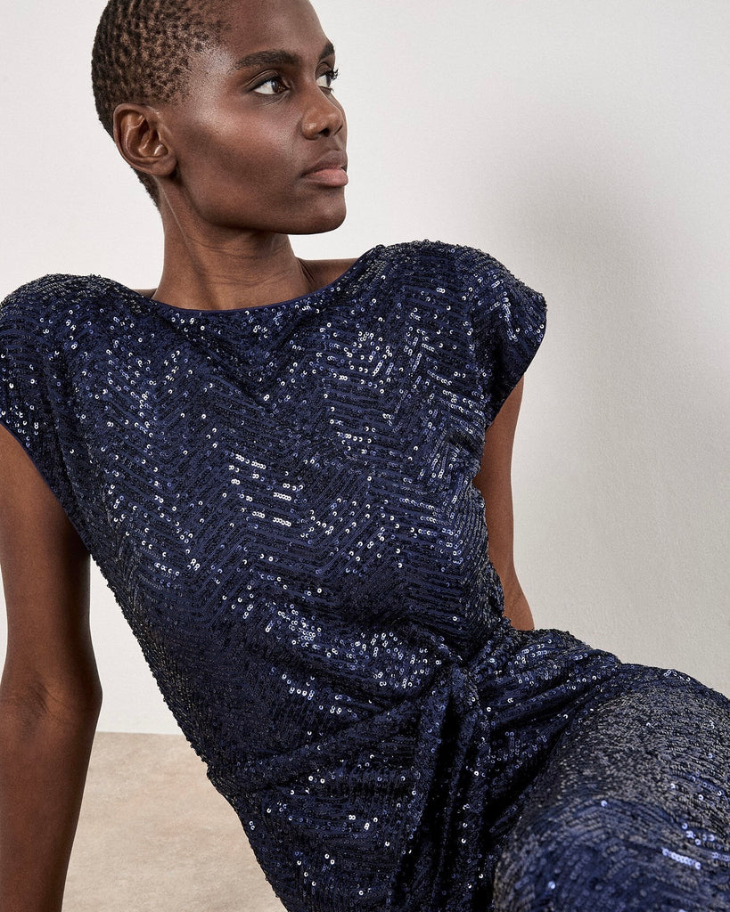 Robe midi col rond sans manches couleur marine avec chevron et paillettes. Style: X122813